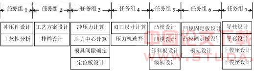 冲模设计过程分为工艺分析计算和冲模结构设计二大阶段。冲模设计过程可分为 7 个并行任务组,如图 1 所示。
