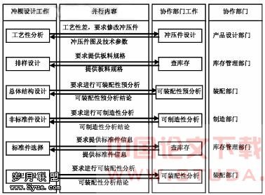 冲模设计过程中需要与其它部门进行并行的阶段及其并行内容,图 2 所示。