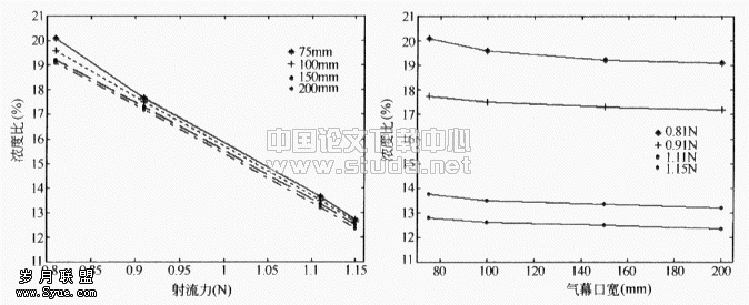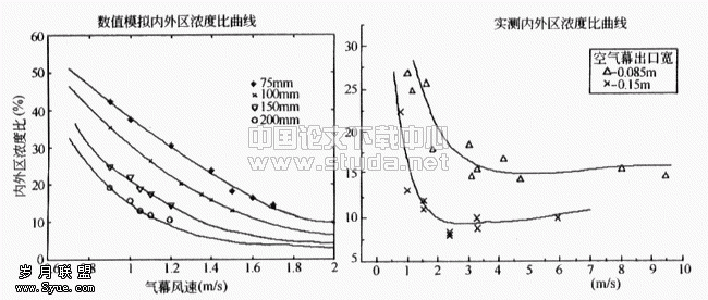 因此可以认为:随射流力的增大,内外区浓度比降低。宽口低速气幕比窗口高速气幕隔断效果好的原因是前者的射流力较