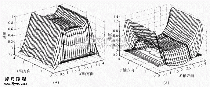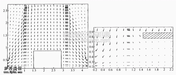 本文对洁净室内通常采用的板式工作台和台式工作台的流场进行模拟和分析。这里给出了有工作台时洁净室流场二维图,从图中可看出障碍物对整个流场影响不大,只是从局部流场看,平板挡住了上部直接来流,改变了四周和下游气流流型,与空态不同,平板下流的流速也比空态时低许多,气幕射流存在向内卷吸收缩趋势。可以推测与全顶棚送风方式相比,本文的洁净方式更不宜采用此类平板工作台,而采用台式工作台时情况有所改善。