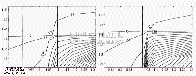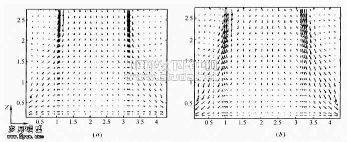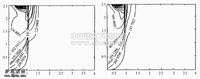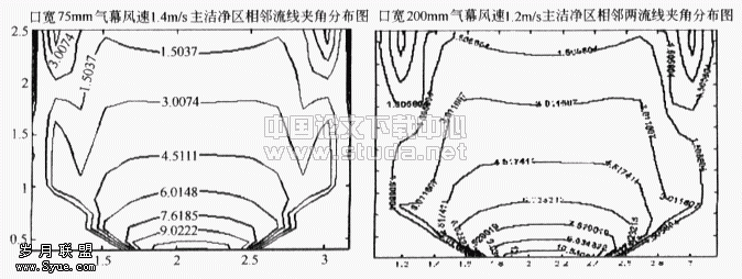 随高度降低,流线夹角数值变化越快。而密集区正好落在涡流三角区中。对同一高度等值线随气幕宽度和风速变化却不大。这说明满足平行条件的单向流场的高度基本不随气幕宽度和风速变化。通过对比还发现,当主送风速度增大时,对满足平行度条件的截面高度影响也不大。