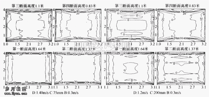 气幕射流的下方等值线变化剧烈,在这个宽度内等值线基本都是竖直的,而在高度1m左右处发生偏转。回风口区和上部的涡流区等值线分布密集,说明这两个区域浓度变化较大。