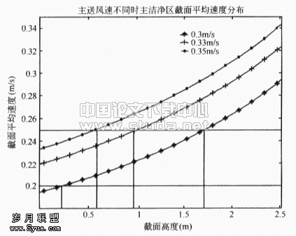 各曲线在一定高度上满足单向流截面平均速度不小于0.25m/s的要求,且满足这一要求的截面高度随主送风速度增大而降低。例如主送风速0.3m/s时最低为1.7m;0.33m/s时最低为0.85m;0.35m/s时最低为0.65m。如果按GBJ73-84规定工作区高度截面速度不小于0.25m/s推算,则主送风速度就大于0.33m/s。这也符合平时设计的惯例。