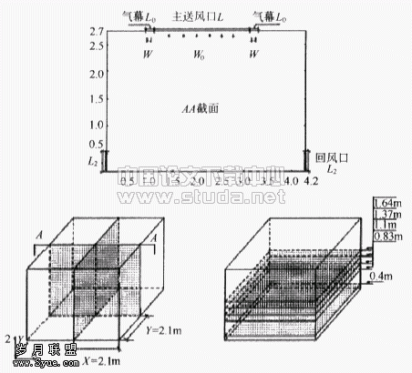 综合单向流的条件,本文推荐送风风速比范围:75mm气幕时比为7~10;100 mm气幕时比为8~5;150mm气幕时为6~4;200 mm气幕时为5~3.5。
