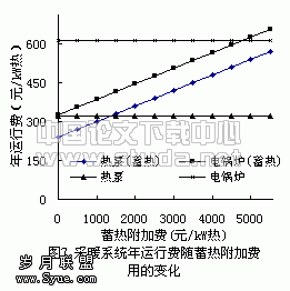 增设蓄热装置后,采暖系统的初投资将会增加,包括蓄热装置的投资和采暖系统本身因蓄热而增加的投资等。这部分附加投资的大小与蓄热装置的型式、体积、位置以及系统运行方式等有关,图7给出了随着这部分附加投资的增加,电锅炉和热泵采暖系统的年运行成本的变化情况。对于电动热泵,只有当单位供热量系统附加投资小于1500元/kW(热)时,采暖系统经济性才会比无蓄热时好。一般情况下系统附加投资小于该值。但如果蓄热器空间占用费昂贵,例如设置在市区黄金地段内,则可能使系统的蓄热附加投资骤增,导致蓄热不能提高整体系统的经济性。对于电锅炉,只要单位供热量蓄热附加投资小于4900元/kW(热),采暖系统经济性就会比无蓄热时好,通常系统蓄热附加投资不会大于此值。因此,对于电动热泵采暖,是否增设蓄热装置,应根据具体情况加以分析论证后决定。而电锅炉采暖增设蓄热装置的效果是很明显的。