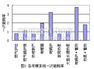 ● 燃油、气锅炉 包括应用于小区或单个楼宇采暖的集中式燃油、气锅炉供热系统和以壁挂气炉等形式设置在房间内的家用燃气炉等。由于天然气等是清洁燃料,这种采暖系统的环境污染远小于燃煤系统。目前,天然气的进京,环保意识的加强,使得燃气锅炉在北京的应用和推广成为可能。另外,燃油、气锅炉运行调节灵活,尤其家用以壁挂气炉,可根据人们的作息情况随时做启停和供热量调整,从而减少了系统运行的最大采暖负荷小时数,节省了燃料量和运行费。但是,当考虑到天然气管网的追加投资,燃气锅炉采暖系统的初投资会明显增高。在运行费方面,由于油、气等燃料价格昂贵,系统的一次能耗也较高(如图3),使得燃油、气锅炉的运行费昂贵。因此,燃油、气锅炉采暖系统,尤其是集中式燃油、气锅炉供热的推广和应用,应在深入的技术经济分析基础上慎重进行。