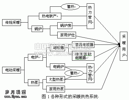 因此,在环保要求高的城市采暖供热中,燃煤锅炉房或燃煤炉灶将严格限制使用,取而代之的几种可能的采暖形式主要有集中供热的电锅炉、大型电动热泵和燃气锅炉房以及分散在用户房间内的家用燃气炉、电暖器等(见图1)。同时,为减小电力网发电的峰谷差,也可考虑在供热系统中设置蓄热装置,使得在满足采暖要求的同时,对电力负荷起到削峰填谷的作用。为此,本文将对上述采暖系统形式的应用作初步的分析与探讨。