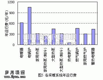 ● 电暖器 一般设置在用户房间内,主要形式有电热微晶玻璃辐射取暖器、电热石英管取暖器、电热油汀等普通电暖器和具有蓄热功能的相变蓄热电暖器等。由于省去传统采暖系统中的热力管道和散热器,一般电暖器的投资明显较低。而且电转换为热后可直接用于采暖,转换效率为100%,避免了电锅炉采暖中因中间介质(热水)而造成的热损失。在运行方面,这种采暖装置调节灵活,使用方便,用户可根据需要对采暖装置的启停随时控制,因而可减少采暖季装置运行时间,进而可减少采暖运行费。因此,电暖器的经济性要好于电锅炉采暖系统,见图5。同时,家用电暖器不需象集中供热那样要有专门人员对采暖系统进行管理、运行和维护,也没有集中供热中所存在的计量受费难题。而且电暖器不会对使用地区产生污染。但是,电暖器存在着单位供热量一次能耗大的缺点(见图3),运行成本也高于一般的采暖系统。由于房间电路容量较小,因而当采暖负荷较大时,存在用户电路改造问题。在采暖效果上,电暖器采暖的舒适感不如传统的水暖散热器。所以,电暖器的使用应根据用户实际情况加以选择,不宜盲目推广。