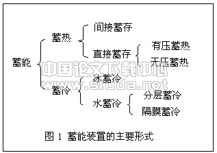 蓄热按蓄存介质的不同有直接蓄存和间接蓄存。间接蓄存采用某种中间介质作为蓄存介质来蓄热。这种蓄热方式的蓄热温度较高,如岩和油组成的蓄存介质蓄热温度达304℃,而用一种熔化的硝酸盐作为蓄热介质蓄热温度可达566℃[6],但间接储存方式的投资大,而采暖空调所用热量温度相对较低,故不宜采取这种蓄热方式。