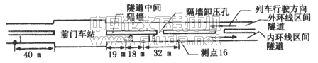 测点15的风速(图10)较测点2的风速(图9)有所降低,是由于在测点15前后隧道隔墙上的一些窗口向另一侧隧道分流了一部分风量所致。测验点16的风速接近于列车正常运行时引起的风速(与图7比较)。