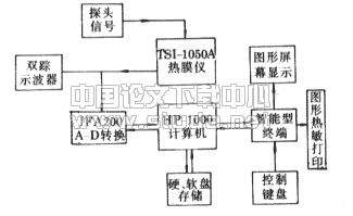 实验采用美国TSI-1050A恒温型热膜/热线流速仪量测流速,探针选用长1mm,直径51μmr 1210-20型圆柱热膜探针。热膜流速仪以热平衡原理为基础,利用置于流场中由电流加热的敏感元件来量测测点速度。TSI-1050A热膜流速仪框图如图4所示,液体速度的变化使探针产生的电讯号经1050A放大处理后,输入IFA-200进行A-D转换,然后输入机主机(HP-100)。智能型终端(2623A型)由键盘控制,并通过它来选择各种采样参数,进行数据存储与计算分析处理,结果可用表格和图形在屏幕上显示,也可由热敏打印机输出。