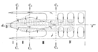 堵头管中的射流,在第I和第Ⅱ区所卷吸的流体来自本身的回流,管内空气产生多次循环,排除的只是从喷口喷入的那部分空气量。