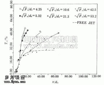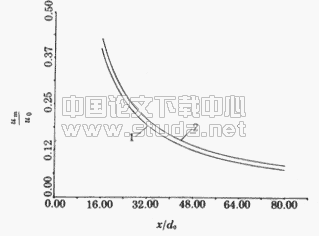 。当受限度很大时,轴线流速急剧下降,射流相对射程x/d0随着受限度减小而增大。而且随着受限程度减小,轴线流速的变化曲线互相趋于接近,当受限度很时,趋近于图8中用虚线表示的自由射流轴线流速变化曲线,射流受了程度越大,其轴线流速变化曲线um/u0=f(x/d0)离自由射流的曲线越远。