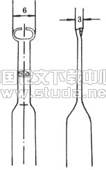 喷入堵头管中的受限射流,其流场特点是内部存在零流速点,且上下流动方向相反,而采用标准的热膜探针不论流速方向如何,输出的电压值总是正值,所以必须采用其它方法判定流速方向。根据[11][12]设计了正反流分界线探针(图5),探针头部是两根相对的直径为1mm的细管,两细管彼此错开约1mm,可感受两个方向的压力。将此探针由各测断面的圆孔伸入堵头管内,只有当轴向流速为零时,两细管感受的压力才相等,将探针在各断面上下移动,即可测得正反流分界位置,即射流边界。文献[12]用这种探针测量了通道内稳定器后带回流区流场正反流分界线,通过分析认量测结果是可靠的。