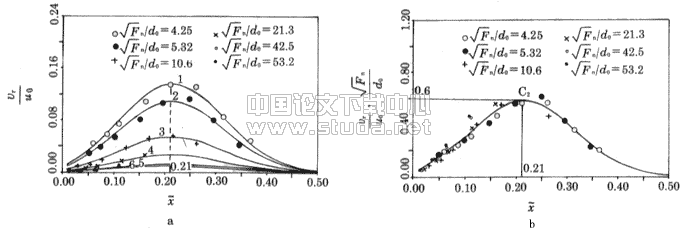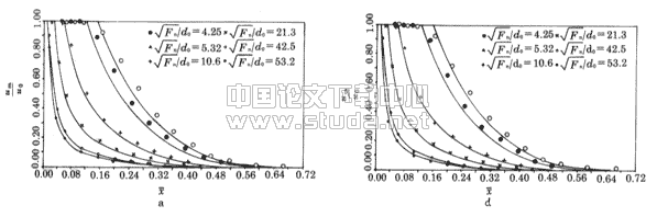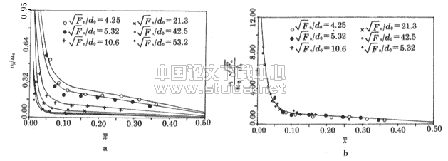 表示的轴线流速沿程变化。图9a中曲线表示巴哈列夫经验公式计算值。从图中可见,实测值与经验公式计算值在趋势上是一致的,但在数值上,前者大于后者。巴哈列夫的受限射流轴线流速经验公式是把受限度