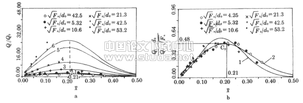 (7)如图11b中曲线2所示。图11a中的曲线也是根据式(7)给出的。两图中小受限度的一些断面与其它实验点偏离的原因可能是小受限度时,喷口直径很小,相应的喷口流量Q 0也小,这样流速量测时较小的误差可能导致Qj /Q 0较大的误差,故在拟合式(7)时没有包括明显有误差之点。