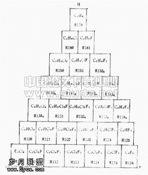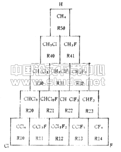 1 氯氟烃物质与氟利昂物质 在氯氟烃物质(CFCs)已经限制生产并即将禁止使用的今天,人们常误把氯氟烃物质完全赞同于氟利昂物质。其实,氯氟烃物质是属于氟利昂物质中的一种,由于这种物质严重破坏大气臭氧层,故专门称之为氯氟烃物质,以区别于其他氟利昂物质。 氟利昂物质是饱和碳氢化合物(饱和烃)的卤族衍生物的总称,本世纪30年代开始用作制冷剂,它的出现解决了对制冷剂有各种要求的问题。根据饱和碳氢化合物是甲烷(CH4)或乙烷(C2F6)的不同,氟利昂物质分为甲烷族与乙烷族,如图1和图2所示,两者均可排为以氢(H)、氯(Cl)、氟(F)三元素为顶点的三角形,其中甲烷或乙烷中的氢部分或全部被氯、氟置换;按照氢元素被卤元素置换的情况,氟利昂物质可分为六种: 图1 甲烷族氟利昂物质 图2 乙烷族氟利昂物质