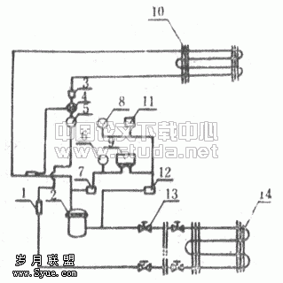 统计资料表明,典型的医院手术室尺寸为6m×6m,使用面积为36m2,净高3m。一般手术期间室内可能由8名医务人员组成的手术组和一名病人。其它产热产湿量不大。HFJ-13净化空调机组即以此为使用对象进行设计。 根据前面介绍的手术室内空气参数要求,确定HFJ-13净化空调机组可保证的室内干球温度为25±1℃,相对湿度为50%±10%。根据上述室内条件及我国最不利地区的冬、夏季室外设计条件,后确定机组制冷量为13Kw,加热量为9kW,加湿能为7kg/h,即可满足要求。 为使手术室内空气中细菌浓度减少,需要一定的换气次数。国外研究资料表明,随着手术室内换气次数的增加,空气中细菌浓度相应减少。但换气次数的增加将导致机组风量增加,能耗增加及尺寸增大。美国传染病中心研究的结论是换气次数19~20h-1时,一个有9人的手术室里,细菌浓度为35~106个/m3,要将此值降至18个/m3,则换气次数需增加五倍以上。目前对乱流手术室的经济换气次数美国推荐20~25h-1,日本推荐18~20h-1。考虑到合适的冷量风量比例,将HFJ-13机组风量定为2500m3/h,这时典型手术室内换气次数将为23h-1,是比较合理的。 关于新风百分比的问题,美国早期曾规定在医院手术室里禁止使用再循环空气,故手术室的空调机组应为全新风机组。但后来,又经过专门研究,认为100%地用新风不是最好,相反使用再循环空气可以使手术室中浮游细菌数更少。 国内测定资料也说明手术室内空气中落菌数比室外大气中落菌数低很多,所以允许净化空调机组使用部分新风。经分析对HFJ-13机组,如果使用15%的新风,则可使典型手术室内每人新风量达到42m3/h,已不算少,故HFJ-13机组的新风比定为0.15。 4 HFJ-13机组结构特点及主要性能 HFJ-13净化空调机组为风冷式,压缩机和冷凝器置于室外,室内部分只有蒸发器、风机、加热器、加湿器和三级过滤器。 由于净化机组空气阻力较大,而国内目前沿无高压头低噪声小风机产品,故选用两个相同型号的风机串联,以满足机组风量、风压要求。机组总体布置如图1所示。制冷系统如图2所示。  图1 机组总体布置图  图2制冷系统图 1-干燥过滤器;2-压缩机;3-分液器;4-膨胀阀;5-视液镜; 6-低压压力表;7-低压三通阀;8-高压压力表;9-高低压控制器; 10-蒸发器; 11-高压控制器,12-高压三通阀;13-截止阀;14-冷凝器 蒸发器和冷凝器都采用了波纹肋片管。与当前广为流行的条缝肋片或冲缝片相比。这种肋片管风侧阻力不大,又在一定程度上提高了传热性能,是一种较好的结果型式。空气加热器用的是带翅片的电热管,这种结构型式担忧热管热流密度大,因而减小了加热器的尺寸,便于安装。 空气加湿器为电极式,外壳由塑料制成,防腐性能好。为了减少水垢积累,加湿器设有反冲水系统。 粗效过滤器用TL-C-07无纺布制成,初阻力29.4Pa,容尘量300g/m2,对直径≥0.5μm的尘粒过滤效率为27.6%. 中效过滤器用FTL-1无纺布制成,初阻力68.8Pa,容尘量450g/m2,对直径≥0.5μm的尘粒过滤效率为30%。 末级过滤器采用YGG型亚高效过滤器,该亚高效过滤器对直径≥0.5μm的尘粒过滤效率为99%左右,初阻力为69.7Pa。 此外,HFJ-13净化空调机组还装有15W此外线灭菌灯,停机时可做空气灭菌消毒用。 为了保证空气净化的严格要求,HFJ-13机组采用了双层金属夹玻璃棉的方法保温,机柜内部还采用了不易脱落的热固性聚氨酯粉末喷涂方法达到了防腐目的。过滤器间及机柜的密封采用了机械密封。 HFJ-13净化空调机组主要性能见表2。 表2 | 制冷量 | 13 | Kw | | 风量 | 2500 | m3/h | | 机外静压 | 147 | Pa | | 加热能力 | 9.6 | kW | | 加湿能力 | 7.0 | kg/h | | 净化效率 | ≥97% | (≥0.5μm尘粒) | | 制冷压缩机功率 | 3.75 | kW | | 制冷剂 | R22 | | | 制冷剂充注量 | 6 | kg | | 送风机功率 | 0.25×2 | kW | | 电极加湿器功率 | 5 | kW | | 冷凝器风机功率 | 0.32×2 | kW | | 机组室内部分尺寸 | 1200×650×2156 | mm | | 机组室内部分重量 | 400 | kg | | 机组室外部分尺寸 | 1340×800×430 | mm | | 机组室外部分重量 | 96 | kg |