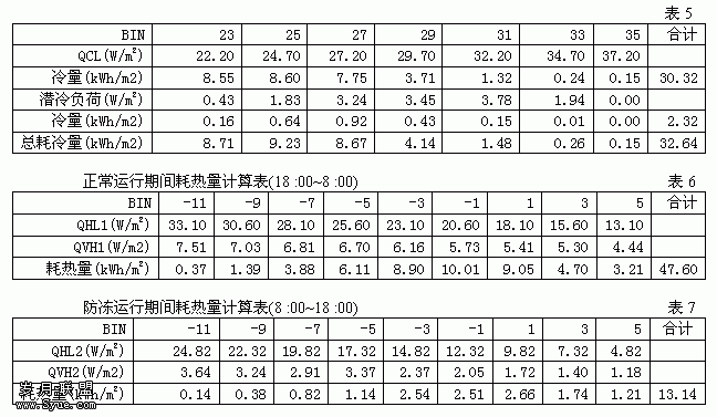 将表1和表2中各BIN段相对应的室外空气温度和相对湿度分别代入(14)~(19)各式,即可得到各频段的冷负荷和供暖热负荷,冷热负荷乘上各对应频段的小时数即得到制冷总耗冷量和供暖耗热量。(天津地区开始制冷时的室外温度取23℃,开始采暖时的室外温度取5℃)。