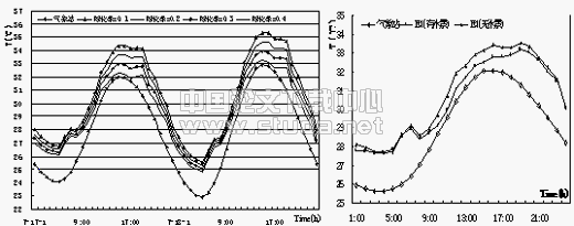 | 4、水景布置权重系数根据有无水景,以及水景设施在划分区域里的所占面积比例确定。 所模拟小区内的温度结果如图2、图3所示。总的说,与气象站气温比较,小区内的气温出现了一定程度的热岛现象;且就一天的气温变化而言,热岛强度晚间较强,白天午间相对较弱。同时从下午2、3点以后,气温将持续地保持高向走势,直至晚上8、9点以后才逐渐回落。从图2、3中可以看出,尽管在夜间各区域的气温相差很小,但在白天各区的气温还是呈现出较大的差异。其中的原因在于小区中某些区域的建筑布局合理,建筑间距选择合适(天空视角系数较高而利于长波辐射冷却);且室外的集中绿地多,小区绿化好,并或多 | |||||||||||||||||||||||||||||||||||||||||||||||||||||||||||||||||||||||||||||||||||||||||||||||||