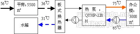 55℃地热水首先通过原系统供给平房,尽可能释放热量后进入热泵,经板式换热器与循环水进行热量交换,进行完热量交换的循环水进高温水源热泵机组经热量提升后,输出75℃高温热水供给末端为散热器片的3000㎡办公楼供暖。地热水供应平房温度降低后,进入、板换之前温度降低至不足36℃。