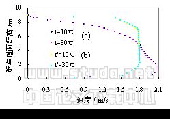 取HRR=5MW,通风速度v=1.64m/s,改变送风温度,隧道中心线不同位置速度分布见图1。显然,送风温度对火源周围及上风方向速度场的影响很小,可以忽略不计。即近似认为临界速度与送风温度无关。