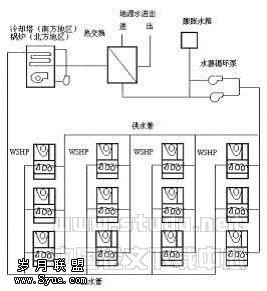 将地源和冷却塔或加热锅炉联合使用作为冷热源的系统,混合系统与分散系统非常类似,只是冷热源系统增加了冷却塔或锅炉。