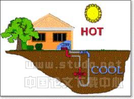土--气型地源热泵技术以美国的技术为代表,水--水地源热泵技术以北欧的技术为代表。二者的差别是:前者从浅层土壤或地下水中取热或向其排热,通过分散布置于各个房间的地源热泵机组直接转换成热风或冷风为房间供暖或制冷。后者是从地下水中取热或向其排热,经过热泵机组转换成热水或冷水,然后再经过布置在各个房间的风机盘管转换成热风或冷风给房间供暖或制冷。由于美国的土--气型地源热泵技术,可以不用地下水,采用埋设垂直管、水平管或向地表水抛设管路等多种方式,直接从浅层土壤取效或向其排热,不受地下水开采的限制,推广的范围更大、更灵活。