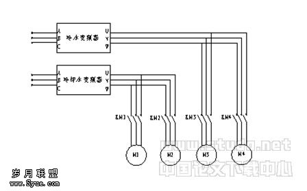 根据具体情况,同时考虑到成本控制,原有的电器设备尽可能的利用。冷冻水泵及冷却水泵均采用一用一备的方式运行,使用一台变频器控制拖动两台水泵交替运行。将一台扬程较高的冷水泵作为备用。
