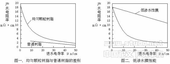 (2) 用100μ的均粒树脂比常规40目~60目树脂为好。优点是装填密度大、脱盐率高、产水量大。见图一*2。