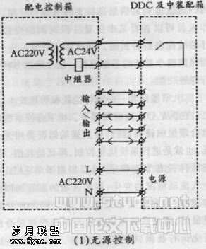 ◎本地DDC的电源(AC 220V)由配电控制箱提供,上图DDC有源控制和无源控制两种方式,笔者认为优选有源控制,因有时配电控制回路并未设控制隔离变压器,这样无源控制触点有可能直接接人AC 220V回路,造成与其他控制线路不能共管敷设;另一方面,自控系统的控制电源宜由自己提供,避免造成扯皮现象。