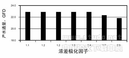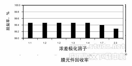 使用氯化钠溶液进行的短期测试结果显示,在相对较高的回收率时(对应CPF为1.4,图11和图12)膜性能比很稳定。但是在实际的现场操作中,这会使膜速度加快。