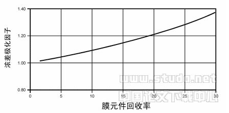单个膜元件的回收率与CPF的关系如图10所示。通常对40”(100cm)长的膜元件限制值是1.2,此时对应回收率大约为18%。
