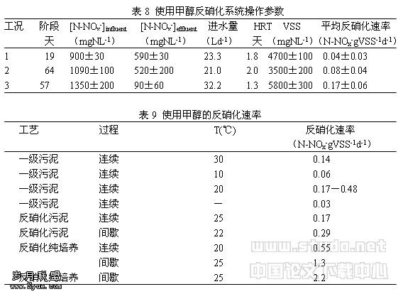 表9对比了利用甲醇混合物为碳源取得的MDR和不同已经出版了用纯甲醇为碳源的研究。一级污泥硝化和反硝化系统的反硝化速率是很大的,有比本研究更高和更低值。反硝化污泥系统和纯培养的结果比所有目前研究都要高。更低速率是由于碳源使用在本目前研究,纯的甲醇不能利用。