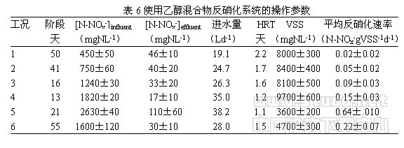 温度保持20℃,外加碳源流量被调节保持/N比率为5gN-1,以确保系统不被有机物抑制。200天外加碳源研究分成6个运行阶段。表6概括了运行参数的数值和给出了每个运行阶段的氮和生物浓度平均值,采用了标准偏差。反硝化速率的误差根据消耗量来计算,误差与每个浓度标准偏差。
