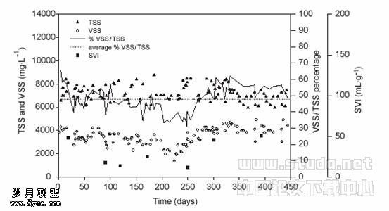 硝化反应池开始生物量浓度大约为4000mgVSS/L。图2显示该反应池的VSS和TSS浓度和它的SVI。在整个研究中VSS浓度保持在3500±700mgVSS/L。VSS/TSS比率为48±8%。但是,这个比率在200至250天时低于平均值;值降低是由于外加碱源引起的。最初碳酸钠改变为另一种便宜的碱源氢氧化钙;硝化反应池中添加钙离子引起硫酸盐和氯化沉淀。那些盐分增加了污泥无机成分,VSS/TSS比率减少到30-35%。为了解决该问题,碱源再用碳酸钠,VSS/TSS比率达到本研究的平均值。在整个研究中硝化污泥有好的沉淀性,VSI值低于50mL/g。