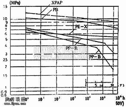 一、前言 随着人民生活水平的提高、技术的发展以及节约能源意识的增强,供暖系统也相应的发生了很大的变化。具体表现为:供热的计费方法由过去的按面积收费,改为按实际用热量收费;供暖方式也多采用地板辐射供暖。这种供暖方式不仅具有能利用低品位能源、节约常规能源、热舒适性好和美观等多种优点,而且更有利于进行热计量,它是一种具很好发展前途和推广价值的供暖方式。 塑料管材产品的促进了供暖系统的发展与变革,随着"以塑代钢"的推广,使塑料管材的优越性在供暖系统中得以充分体现。 二、根据供暖系统的分类,探讨适用于供暖系统的塑料管材 1.常规采暖 常规采暖采用以对流散热为主的散热器,供回水温度一般为95/70℃。一些城市的设计规范已要求新建居民区采用计量供热,若由热计量表测量供热系统入户的流量和供回水温度(目前大多采用热计量表),则要求在供暖系统设计时,每一户都单独布置成一个环路,供回水立管一般布置在楼梯间或厨房的管道井中,由于水平系统的管道过门处理比较难,因此常将管道预埋于地板内。越来越多的预埋管道采用塑料管材,因为它克服了钢管的易腐蚀、连接处渗漏、施工复杂等不利情况,选用适当的塑料管材,在供回水温度95/70℃的条件下,其寿命可达30~50年。塑料管材可根据施工的需要弯曲成型,一般地下埋管不能有接头;并且由于塑料管内壁光滑,在相同的输水能力状况下,管径比较小,可降低建筑成本,减小楼板层厚度。 2.地板辐射供暖 地板辐射供暖就是在地板下铺设加热管道,使地面成为一个辐射传热为主的加热面,根据卫生要求,地表面温度一般不应高于30℃,其辐射散热量占总供热量的60%左右[1]。供暖房间的空气温度分布均匀,形成符合人体舒适度要求的热环境,给人以足热头凉之感,同时降低了房间的热负荷。地板辐射供暖的供水温度一般不高于60℃,供回水平均温度为40~50℃,因此可采用PP-R、PP-B或PE-X等物美价廉的塑料管材;同时,PP-R、PP-B管材可以二次熔焊,因此施工快捷方便。由于地下埋管中没有接头(使用一根管),减少了维修的工作量。 三、用于供暖系统的塑料管材及特性 1.塑料管材的分类 目前塑料管材的种类很多,但从塑料管的软化温度、热稳定性和强度等方面考虑,适用于常规供暖和地板辐射供暖系统的塑料管材主要有下列5种{2}: (1)交联铝塑复合管(Cross linked polyethylene aluminium compound pipe) 交联铝塑复合管的内层和外层均为密度大于0.94g/cm2的聚乙燃或聚乙烯聚合物,中间为增强铝管,每层中间用热熔胶紧密粘合形成一体管材;用做常规供暖的加热管时,为满足输送95/70℃的高温水,管内、外层均应为交联聚乙烯,通常记为XPAP。 (2)交联聚乙烯管(Cross linked polyethylene pipe) 以密度大于0394g/cm2的聚乙燃或聚乙烯聚合物,添加适量的助剂,通过化学元素的或物理的方法,使春线形的大分子交联成三维网状的大分子结构,由此种材料制成的塑料管材,通常记为 PE-X。 (3)聚丁烯管(Polybutylene pipe) 由聚丁烯-1树脂添加适量的助刘,经挤压成型的热塑料管材,通常记为PB。 (4)无夫共聚聚丙烯管(Modified polypropylene pipe) 以丙烯和适量乙烯的无规共聚物,添加适量的助剂,经挤压成型的热塑料管材,通常记为PP-R。 (5)嵌段共聚聚丙烯管(Modified polypropylene pipe) 嵌段共聚聚丙烯管为II型聚丙烯管(PP Blook copolymer),在德国称其为PP-B,而韩国称其为PP-C1。PP-B的柔韧性不如PP-R,但是其耐低温冲击的能力却比PP-R强,因此PP-B管比较适合在北方使用,一般室外温度达到0℃时,管材也不会脆裂。PP-B管比PP-R管便宜,当热媒温度不超过60℃,系统压力小于0.6MPa时,可以采用PP-B管。 2.塑料管材特性 (1)管材的等应变蠕变特性曲线(3)(见图-1)  图-1 70条件下各种管材的等应变蠕变特性曲线 图-1为各种管材在水温为70℃条件下等应变蠕变特性曲线,当水温提高时,在同等的压力条件下,温度每增加10℃,其寿命以2.5倍的速率降低。 (2)塑料管材的一般物理力学性能 | 项目 | 单位 | 指标 | | XPAP | PB | PE-X | PP-R | | 密度 | g/cm3 | ≥0.93 | ≥0.92 | ≥0.94 | 0.89-0.91 | | 纵向回缩率 | % | ≤2 | ≤2 | ≤2 | ≤2 | | 工作压力 | Mpa | ≤1.5 | ≤0.8 | ≤0.8 | ≤0.8 | | 使用温度 | ℃ | ≤95 | 70 | 65 | 65 | 蠕 变 性 | 环应力 | Mpa | 2.2 | 15.5 | 6.0 | 12 | 4.4 | 16.5 | 3.5 | | 温度 | ℃ | 95 | 20 | 95 | 20 | 95 | 20 | 95 | | 时间 | h | 10 | ≥1 | ≥103 | ≥1 | ≥103 | ≥1 | ≥103 | 交 联 度 | 硅烷 | % | ≥65 | | ≥65 | | | 过氧化物 | % | ≥70 | ≥70 | | 辐射 | % | ≥60 | ≥60 | | 维卡软化温度 | ℃ | ≥105 | 113 | 123 | 140 | | 搞拉强度 | Mpa | ≥23 | ≥17 | ≥17 | ≥27 | | 断裂延伸率 | % | ≥350 | ≥280 | ≥400 | ≥700 | | 导热系数 | W/m.K | ≥0.45 | ≥0.33 | ≥0.41 | ≥0.37 | | 线性膨胀系数 | mm/m.K | 0.025 | 0.130 | 0.200 | 0.180 |