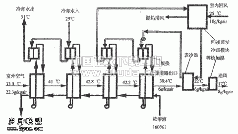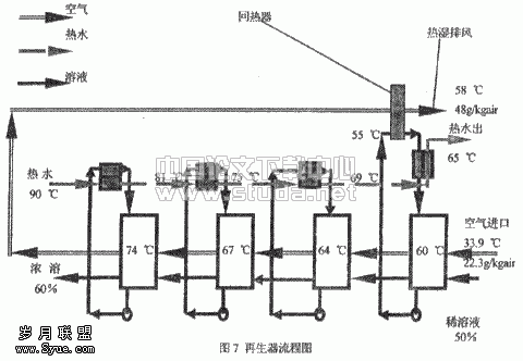 4. 可以方便的实现蓄能,系统中设储浓溶液的容器,负荷小的时候储存浓溶液,负荷大的时候用来除湿,从而减小了系统的容量和相应的投资;单位质量蓄冷能力为冰的蓄冷能力的60%,而且无需保温等措施。