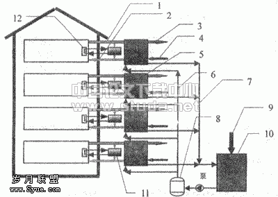 将液体除湿系统的空气处理部分和再生部分分开,并且多个空气处理部分共用一个再生器,构成如图8所示的集中再生的液体除湿空调系统。集中的再生器可采用多级回热的形式以提高其效率。浓溶液分出各个支路通往空气处理模块,吸湿后的稀溶液通过管路流回再生器再生,如此循环。溶液的回路带有储液灌,起到了蓄能调峰的作用。末端的空气处理模块有两股空气流过,即被处理的空气3和起冷却作用的空气2,被处理的空气被除湿并冷却,放出的热量被排风吸收,排到大气中。还有一小部分经过除湿的干空气通过蒸发冷却的方法产生冷水可以冷却除湿后温度较高的送风达到适宜的送风温度,如图中的11所示。