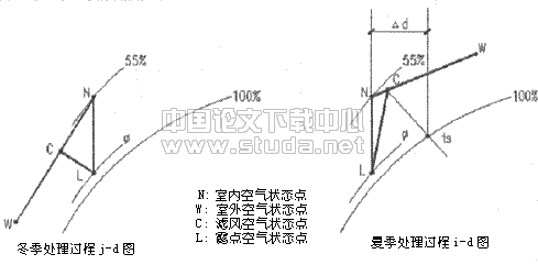 通常,空调设备选择应满足最不利时的空调要求。为节省空调冷量,在保证卫生条件的同时以最小新风量为原则。随着室外空气温度降低,其空气焓值越来越趋向车间空气焓值,这时不断加大新、回风比例,当室外空气焓值达到车间焓值时,则采用全新风。