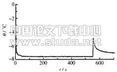 图 4是某次实验的温度变化曲线。实验开始后,测量点温度从0℃迅速降至预定温度±0.1℃的范围。过冷水结冰时迅速释放潜热,使得测量点温度突然升高,图4中曲线上的小尖峰标志着结冰的发生。定义测量点温度降至预定温度到过冷水发生结冰的时间为过冷水的结冰时间。