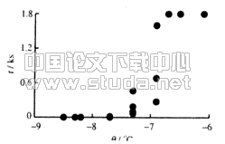 作者对于一给定表面,在表面温度θ1<θ2<…<θn下分别测量表面上过冷水发生结冰的时间。根据表面θNPLU的定义,若记在1800s内过冷水发生结冰的所有测量中表面温度的最高值为θi,则表面的θNPLU介于θi,θi+1之间。图5给出了不锈钢平板表面的测量情况,图中在横轴上的点代表结冰时间小于1s,对应于结冰时间为1800s的点代表结冰时间大于1800s。根据图5,对于不锈钢平板表面,-6.9℃<θNPLU<-6.7℃。