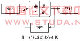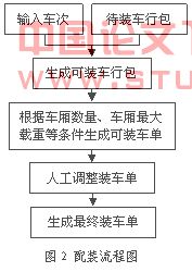 铁路行李包裹运输(以下简称行包运输)是利用铁路客运设施,以随挂旅客列车的行李车为载体的一种运输形式[1],其业务流程如图1所示。近年来,随着行包运输业务量的增长,大部分车站在承运、交付、中转和综合统计报表打印等都实现了机的自动化管理。但是,在整个业务流程中的装车单生成部分,现如今依然采用人工或半人工的方式进行处理。由于与“装车”相关的因素较多,所以大多的铁路行包管理系统对此采取回避的办法。如今,在行包运输中出现的大部分问题如货物漏装、错装、中转不畅、快件不快等问题均是由行包装配不当引起的[2]。为此,解决好行包配装问题,优化运载设备的利用率,降低运输成本是一个非常有价值的研究课题。本文从行包管理软件编程的实际出发,提出了一种优化的行包配装算法,并给出了实现方法。