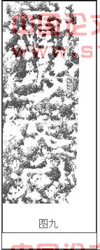 从这些石刻文字整体来看,应该属于东汉后期民间的通俗隶书,虽然是隶书,但是里面蕴含着楷书的因素,这些文字应和南阳出土的《许阿瞿画像石题记》所刻的年代大致相同。在这些石刻文字中,还有一个普遍的现象,大部分的名字第一个字刻写都很大,第二字或第三字相对较小,这是不是当时民间的一种书写习惯或者是有其它的原因。在这些石刻文字当中,如“何武”(图四)、“何吴石”(图六)、“苏文遼”(图十)、“庞君高”(图五)等字,结体宽博,波磔分明,隶书的味道比较浓,书法风格类似于《石门颂》之类的摩崖石刻。从这几个名字的书写来看,书者应该属于书写水平比较高的人。 如“云伯山石”(图八)、“西门廿二淳”(图七)、“鲁孟山”、“陈雎”等字,几乎看不到了隶书的波磔特征,基本上已成了楷书的体势,只是还略带点隶书的余韵。
