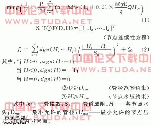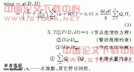 该数学模型是以经济性为目标函数,将其余条件作为约束条件(水力约束和可靠性约束)。由于水质的可靠性指标难以量化,故未考虑水质的约束条件,同样由于可靠性指标的度量问题,水压的约束也仅仅是要求水源泵站扬程必须满足控制点的水压要求,只要控制点的压力在最高用水时可以达到最小服务水头,整个管网就不会存在低压区。此外,也要考虑管径的范围约束,以保证管网的水量和水压。