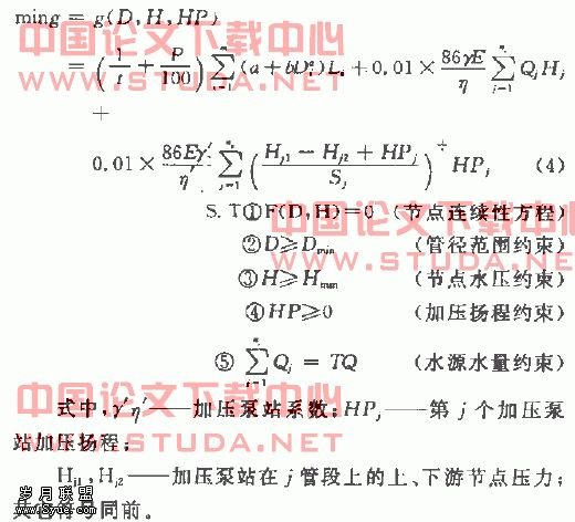 该数学模型与上述系统不同的是,每一水源的供水量,随着供水区用水量、水源的水压以及管网中的水头损失而变化,从而存在各水源之间的流量分配问题,即要考虑到水源的水量约束条件。 2.3 设加压泵站环状网的优化设计数学模型