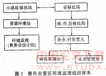 小浪底移民安置区环境监理工作由小浪底建设管理局下属的移民局负责,具体办事机构为移民局 资源环境处,黄河流域水利委员会勘测规划设计研究院受移民局委托负责移民安置区环境监理的日常工作.各级移民机构和移民村环保员负责移民安置 区环境保护工作的组织与实施.组织体系见图