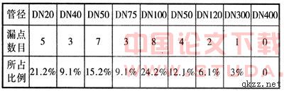 (1)小口径管道较易发生漏损。下表是我们根据不同管径管道漏点数目所列统计表: 从上表统计可知DN20-DN200管道上发现的漏失占总漏失的97%,从我们对河南省内其他县市水司供水管道测漏的统计数据看具有同样的规律。分析起成因是:首先是这种管径的管道在整个管网中所占的比例较大;其次,温度应力和水锤效应对小管径管道的影响要大一些;而且小管径管道埋深一般较小,地面荷载突然增大(如过载重车辆)时也容易引起漏损。