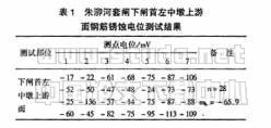 朱泖河套闸下闸首左中墩上游面混凝土钢筋锈蚀电位测试结果见表1。在检测表面抽检了28个测点,电位范围-22mV~-136mV,平均电位-65.9mV,钢筋处于完好状态。测试后对某一检测点进行了凿除对比检查,检查结果为钢筋状态完好,未锈蚀。