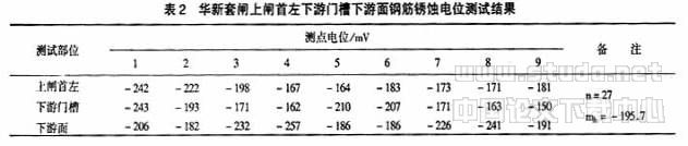 华新套闸上闸首左下游门槽下游面混凝土钢筋锈蚀电位测试结果见表2。在检测表面抽检了27个测点,电位范围-150mV~-257mV,平均电位-195mV,钢筋基本处于局部锈蚀状态,部分处于全部锈蚀状态。测试结果与现场实测的混凝土碳化深度、钢筋保护层厚度变化基本一致,即混凝土碳化深度越深,钢筋保护层厚度越薄,则混凝土钢筋锈蚀电位负值越大。